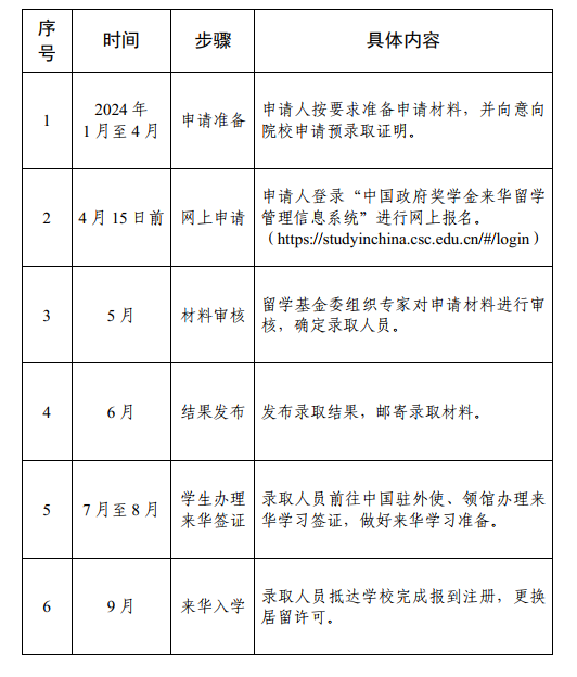 申请人应于北京时间2024年4月15日24:00前登录中国政府奖学金来华留学管理信息系统(http:// studyinchina.csc.edu.cn/#/login)进行网上报名,并向国家留学基金提交申请材料。