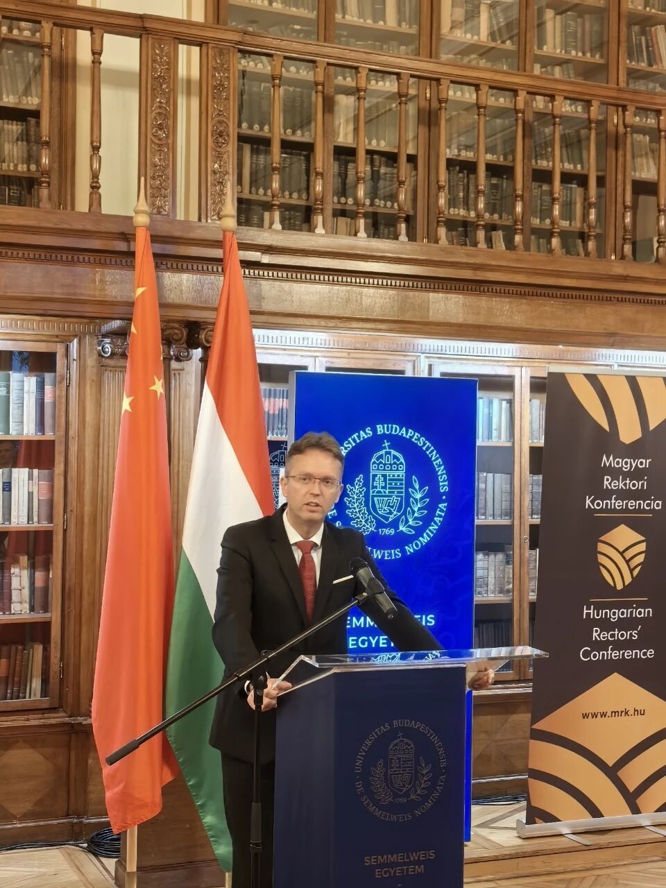 9月22日至23日,中国-匈牙利大学校长对话会在布达佩斯举行,驻匈大使龚韬出席并致辞。匈文化与创新部部长汉科、匈大学校长联盟主席默克利、中国教育国际交流协会副秘书长傅博致辞,使馆韩冬升参赞、18所中国大学和26所匈牙利大学的代表等约100人参加。