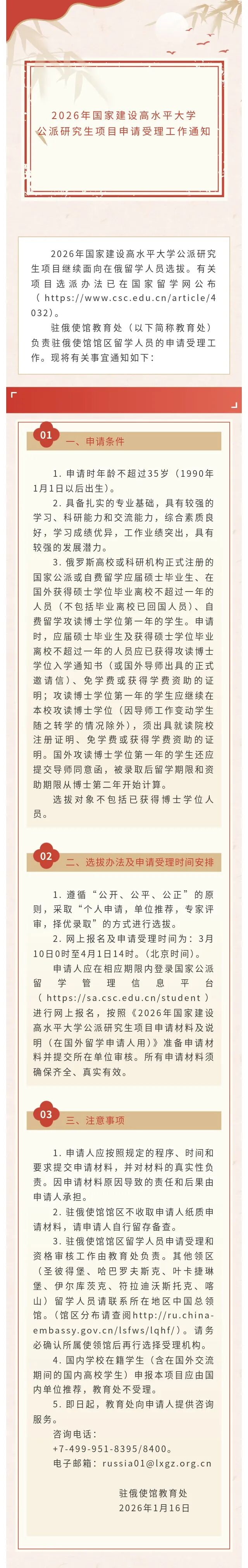 2026年国家建设高水平大学公派研究生项目继续面向在俄留学人员选拔。有关留学人员选拔办法已在国家留学网公布https;//www.csc.edu.cn/article/4032。
