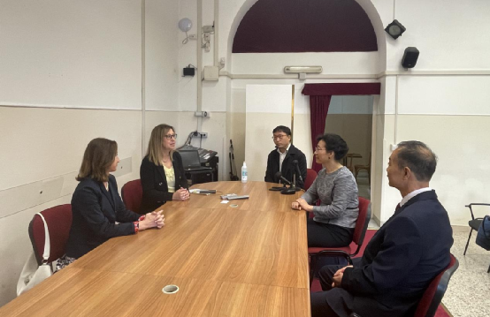 该校校长Elisabetta Durantini女士热情接待郑代办一行,表示这是学校首次接待外交官来访,介绍了学校概况、开展中文教育情况和未来增设中文班计划。郑代办充分肯定学校在积极推进中文教育方面所取得的显著成效,表示使馆愿加强与学校联系,为学校中文教育和举办中国文化活动等提供支持和协助。