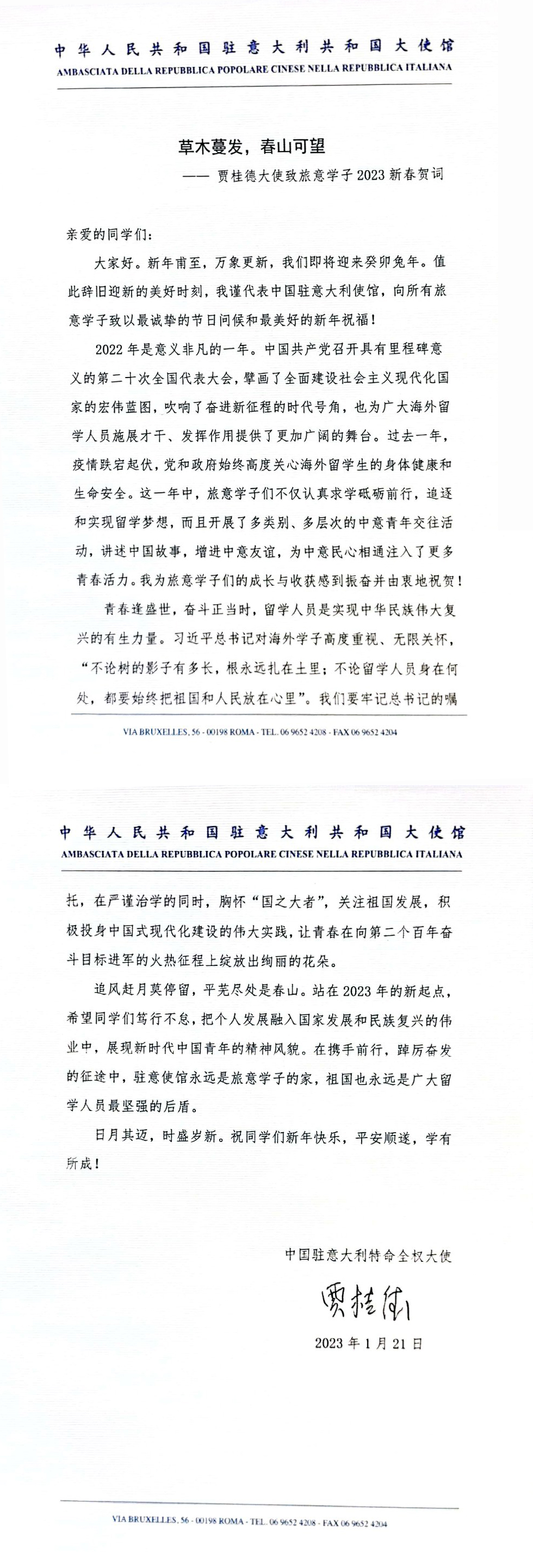草木蔓发,春山可望——贾桂德大使致旅意学子2023新春贺词
