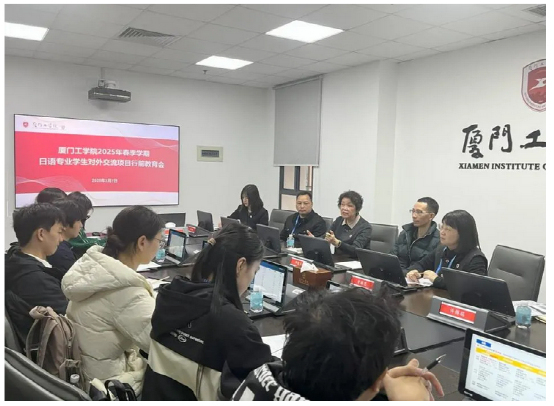 为贯彻教育部“平安留学”行前培训工作部署,提升赴日留学生的安全意识和学术规划能力,厦门工学院于3月7日下午在弦歌堂会议室召开2025年春季学期对外交流项目行前教育会。会议由外国语学院执行院长黄颖思主持,外国语学院院长邱能生、政务处副处长兼国际合作与交流办公室主任许锦端、外语类课程组主任陈端端、相关职能部门人员以及日语专业教师出席,首批赴日交流的13位学生参会。