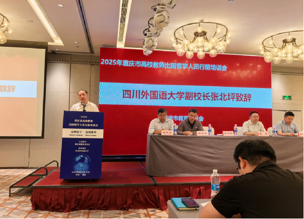 为助力重庆市建设高水平教育对外开放体系,8月26日至29日,由重庆市教育委员会主办、四川外国语大学国际学院(出国培训部)承办的2025年重庆市高校教师出国留学人员行前培训成功举行。来自重庆大学、西南大学、重庆医科大学、重庆医药高等专科学校、重庆城市职业学院等重庆市35所高校的150名出国留学人员参加培训。四川外国语大学副校长张北坪、重庆市教育委员会国际合作与交流处副处长张庆、安徽师范大学法学院院长郭泽强等出席开班典礼。培训以“远骋寰宇近筑繁华”为主题,旨在提升参培学员的跨文化适应能力、国际学术交流能力及海外风险应对能力,实现平安留学。