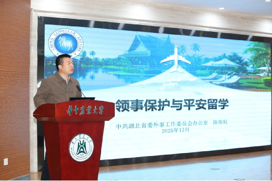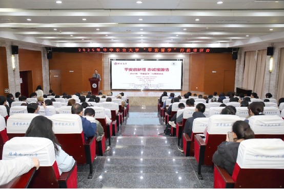 12月11日,由教育部国际合作与交流司指导、教育部留学服务中心主办、华中农业大学协办的2025年下半年“平安留学”行前培训会在华中农业大学学生综合服务楼举行。学校近150名即将赴国(境)外交流学习的师生,和各学院外事秘书、辅导员老师代表等参加培训。中共湖北省委外事工作委员会办公室领事处陈俊权主任,教育部平安留学心理服务专家、中国传媒大学张静研究员,华中农业大学研究生院教育管理处蔡江处长,以及华中农业大学本科生院、人力资源部、国际合作与交流部等单位相关负责人出席培训会。